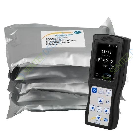 Hijyen / gıda ölçüm cihazı ve ilgili PCE-ATP SWAB kullanılarak temizlik ve dezenfeksiyon önlemlerinin etkinliğini test etmek için ürünle temas eden tüm yüzeylerde gıda ya da mikrobiyolojik kalıntıları hızlı bir şekilde tespit edilebilir. Hijyen / gıda ölçüm cihazı PCE-ATP 1 ile adenozin trifosfat (ATP) tespiti gerçekleştirilebilir.