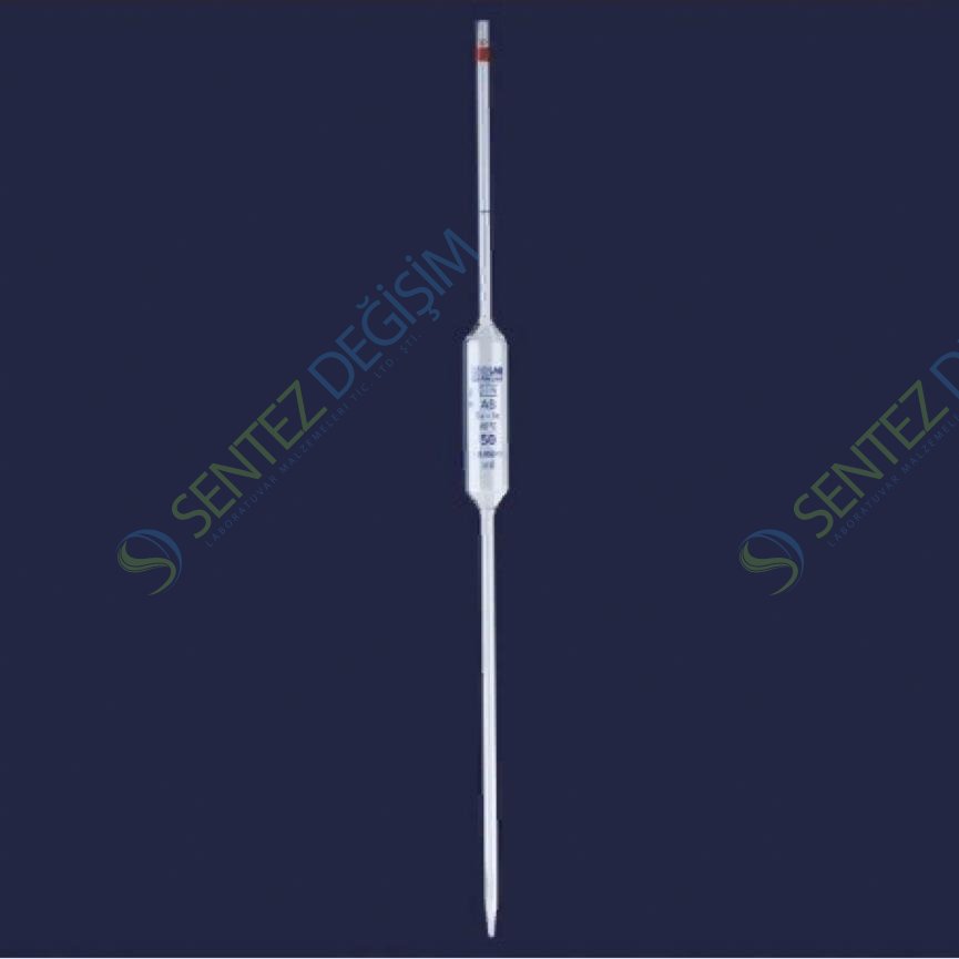 ISOLAB BULLU PİPET mavi baskı, hacim: 5 mL, tolerans : ±0.015 mLNötr cam borudan ISO 648 ve DIN 12687 (bullu pipetlerde) ve ISO 835 ve DIN 12699 (dereceli pipetlerde) standartlarına uygun olarak üretilirler. DIN/ISO Class “AS” standartına uygun olarak kalibre edilirler. Ürünün Almanya federal ölçü ve ağırlık kurallarına uygunluğunu onaylayan (“DE-M”) damgasınını taşırlar. Otomatik robotlar tarafından yürütülen kalibrasyon işlemi, gerçek değerin nominal değerden sapmasını önler. Gövde üzerinde lot numarası ve uygunluk damgası basılıdır. Lot sertifikasına internet web sayfası üzerinden ulaşılabilir. Eğimli ve konik pipet uçları teorik akış hızını garanti edeler. Değişik renk kodlu pipet ağızları sınıflandırmayı ve ayırt edilmeyi kolaylaştırır. Gövde üzerindeki yazı ve işaretlerde mavi boya kullanılır.