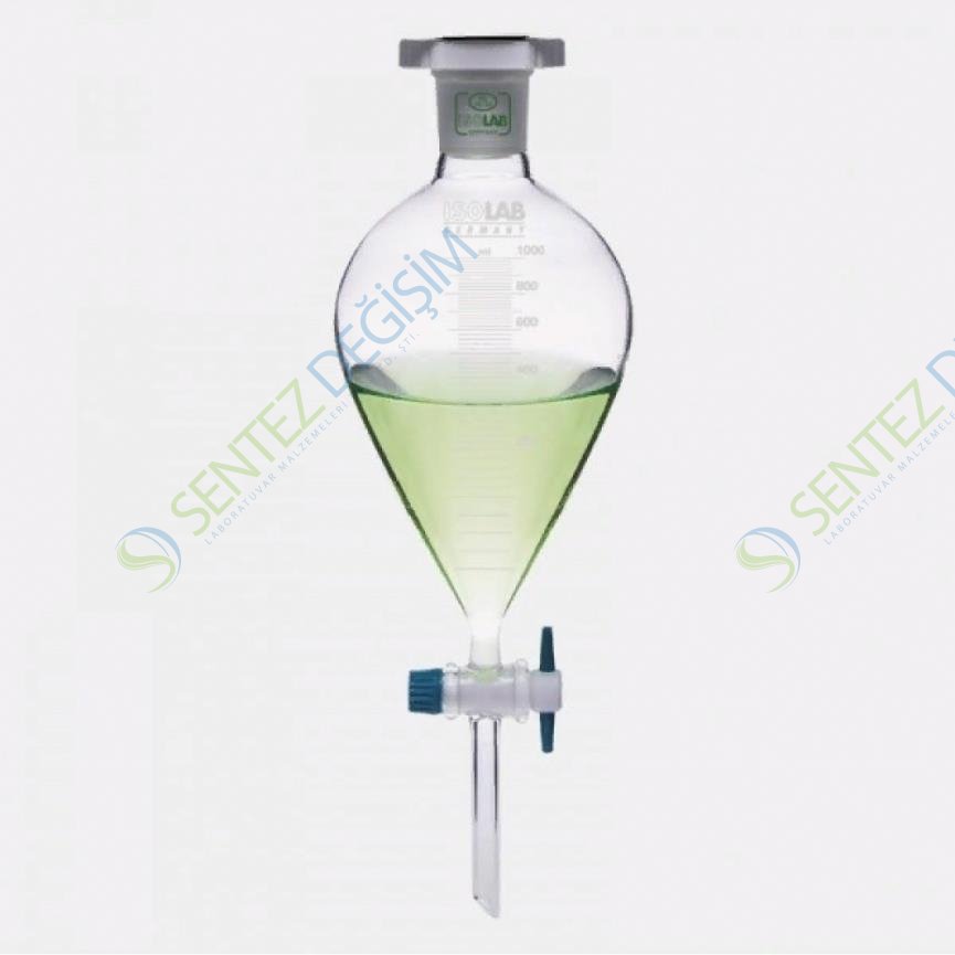 ISOLAB AYIRMA HUNİLERİ ARMUDİ DERECELİ NS 29/32ISO 4800 standardına uygun olarak borosilikat 3.3 camdan gövdede hacim çizelgesi basılı olarak üretilirler. Kuvvetlendirilmiş şilif kenarları taşınma ve yıkama sırasında oluşabilecek kırılmaları önler. Mükemmel rodajlanmış ve pürüzsüz boyun şilifleri DIN 12242 standartına uygun olarak üretilirler. Gövde üzerindeki hacim göstergesi ve işaretlerde beyaz boya kullanılır. P.E kapak ve yağlanmaya gereksinim göstermeyen, değiştirilebilir PTFE musluk ile donatılmışlardır.