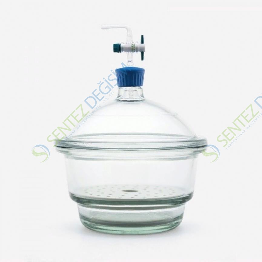 ISOLAB CAM DESİKATÖR Vakum MuslukluKalın, sağlam ve ısıya dayanıklı borosilikat 3.3 camdan vakum musluklu olarak üretilirler. Vakum emiş ve boşaltım işlemlerini güvenli olarak yapabilen 2 yönlü vakum musluğu ile donatılmışlardır. Vakum musluğu maksimum 1 Torr basıncındaki vakumu 24 saatten fazla tutabilir. Mükemmel rodajlanmış gövde ve kapak yakaları kesin sızdırmazlığı garanti ederler. Porselen delikli desikatör tablası ile teslim edilirler.