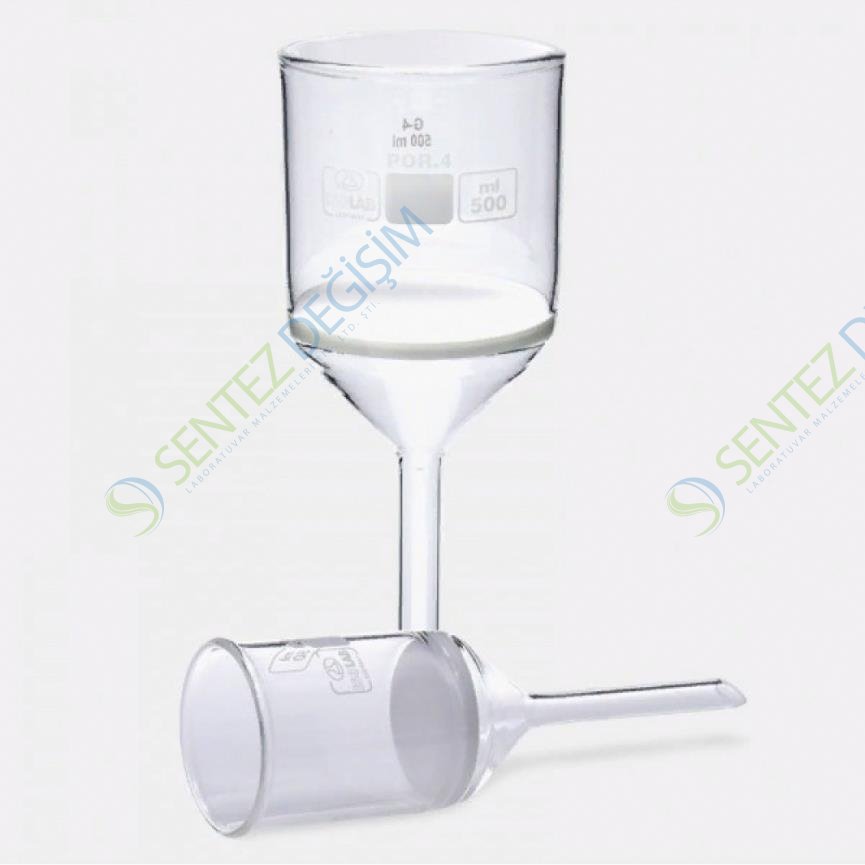 Asitlere dayanıklı sinterlenmiş cam disk ile donatılmış olarak borosilikat 3.3 camdan üretilirler. Herhangi bir filtre kağıdına gerek duyulmaksızın hızlı süzme işlemini garanti ederler. Ağır ve kalın yapıları ve kuvvetlendirilmiş ağız kenarları taşınma ve yıkama sırasında oluşabilecek kırılmaları önler.