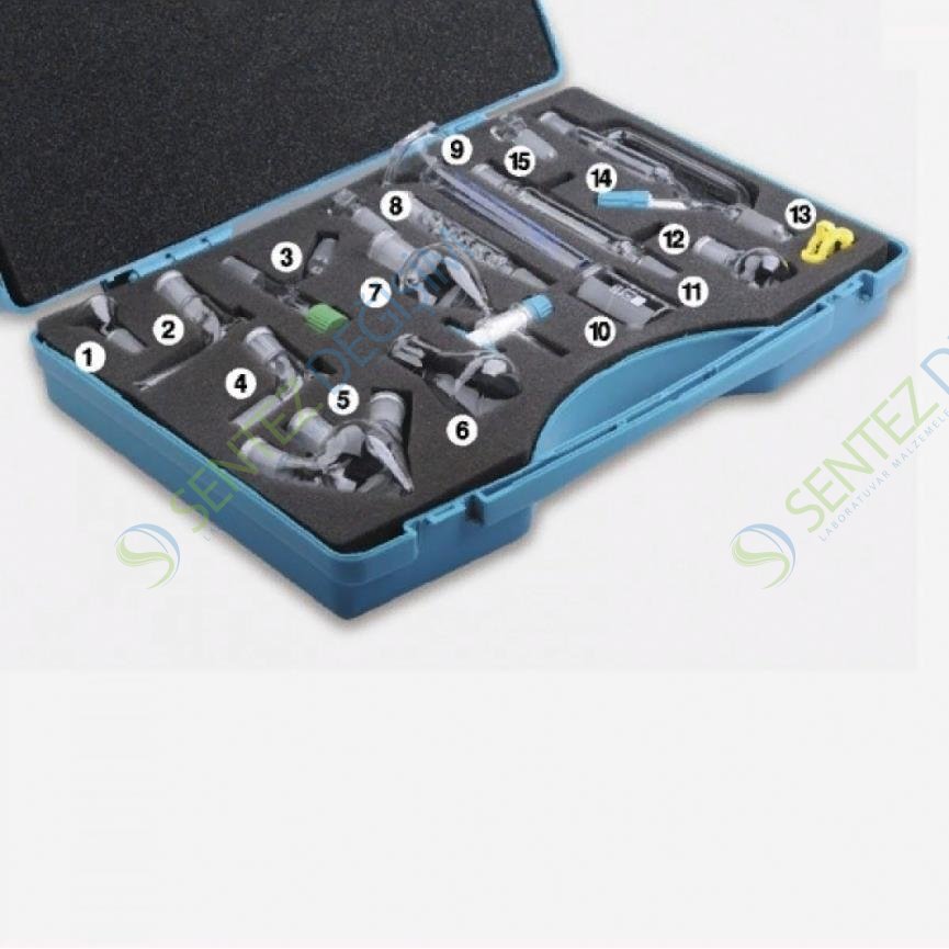 Kimya seti 16 adet NS 14/23 şilifli küçük ebatlı cam malzemeden oluşur. Vakum altında veya oda şartlarında çoklu mikro ölçekli deneyler için uygundur. Kimya seti sünger yuvalar ile donatılmış, sağlam bir taşıma çantası içinde yer alır. Sünger yuvalar, cam malzemelerin kırılmalarını önler. Ksilol metodu ile su tayini amacı ile borosilikat 3.3 cam’dan üretilir. Cihaz NS 29/32 şilifli 500 ml’lik bir balon, 400 mm uzunlukta bir liebig soğutucu ve PTFE musluklu bir ölçüm tüpünden oluşur. Arsenik ve antimon tayini amacı ile borosilikat 3.3 cam’dan üretilir. Cihaz NS 29/32 şilifli 100 ml’lik bir erlen ile erlene monteli absorbiyon düzeneğinden oluşur. Seti oluşturan parçalar aşağıdaki tabloda gösterilmiştir.