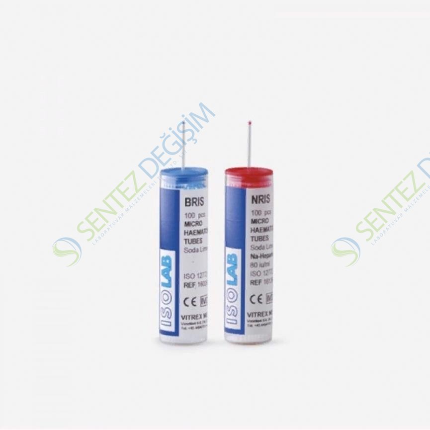 ISOLAB Heparinli Mikrohematokrit Tüp Tam otomatik makinalarda ISO 12772 ve BS 4316-68 standartlarına uygun olarak 75 mm uzunluk ve 0,2 mm et kalınlığına sahip olarak üretilir. Heparinli tüplerin iç yüzeyleri Sodyum Heparinit ile kaplanmıştır.