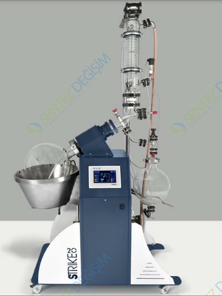 STRIKE 20 Döner EvaporatörST20 hem endüstriyel hem de laboratuvar döner buharlaştırma özelliklerine sahiptir. Agresif madde arıtımına izin veren borosilikat cam ve PTFE kullanılarak tüm proses ihtiyaçlarını karşılar. Tesis, kaynama noktalarının farklılığı nedeniyle uçucu bileşenlerin (düşük kaynama noktası) kalıntı bileşenlerden (yüksek kaynama noktası) ayrılacak şekilde buharlaştırılmasına olanak tanır. Prosesin kolay ve tamamen güvenli başlatma, kontrol ve durdurma prosedürleri: ST20, buharlaştırma kabı ve termostatik banyo için şeffaf bir koruma kalkanıyla donatılmıştır.>Isıtma BanyosuIsıtma banyosu, elektrik kesintisi durumunda sıvının aşırı ısınmasını ve çarpmasını önlemek için otomatik olarak aşağıya inen bir hidrolik sistem aracılığıyla kaldırılır.>Sızdırmazlık sistemiST20'nin harika bir özelliği, mükemmel vakum sızdırmazlığını garanti eden, kendinden yağlamalı malzemeden yapılmış sızdırmazlık sistemidir. Bu sızdırmazlık sistemi herhangi bir bakım gerektirmez.>Basınç ve sıcaklıkST20, atmosferik basınç koşullarında veya vakum altında çalışır. 5 mbar'a kadar mükemmel vakum sızdırmazlığını garanti eder. 5 mbar'a kadar mükemmel sızdırmazlık, akışkanın düşük buharlaşma sıcaklığı nedeniyle işlem süresinin kısaltılmasına olanak tanır. Termostatik banyo hem su hem de yağ ile çalışabilir ve maksimum sıcaklık 150°C'ye ulaşabilir; aynı zamanda atmosferik basınç koşulları altında herhangi bir çözücünün buharlaşmasına da izin verir. Isıtma banyosu 3KW elektrikli ısıtıcılarla donatılmıştır.>Aşağıdaki parametrelerin ölçümü, görsel gösterimi ve kaydı: > Banyo ön ayarı ve gerçek sıcaklık > Buhar ön ayarı ve gerçek sıcaklık > Ön ayarlı ve gerçek dönüş hızı > Ön ayarlı ve gerçek vakum okuması ve ayarı BuharınGörüntülenmesi ve Çalıştırılmasısıcaklık koruması> Maks. buhar sıcaklığı ayarları> Min. buhar sıcaklığı ayarları> Buhar sıcaklığı aralığıDönme ayarları> Dönme anahtarı> Hız ayarlarıBanyo sıcaklığı ayarları> Banyo sıcaklığı anahtarı> Sıcaklık ayarları> Sıcaklık DeltaVakum ayarları> Vakum anahtarı> Vakum ayarları> Vakum DeltaEkranıProses çalışma parametreleri şu adresten ayarlanabilir ve izlenebilir: 7" dokunmatik ekran.Aşağıdaki parametrelerin ölçümü, görüntülenmesi ve veri kaydı:- Banyonun ayarlanan ve gerçek sıcaklık değeri- Ayarlanan ve gerçek buhar sıcaklığı değeri- Buharlaşma kabının ayarlanan ve gerçek dönüş hızı değeri- Ayarlanan ve gerçekleşen vakum değeri (vakum kontrolörü standart olarak dahildir)Uygulama- Damıtma (sürekli ve süreksiz)- Solvent geri dönüşümü- Geri akış proses reaksiyonu- Bileşen kurutma- İnce kimyasal sentez- Kristalizasyon- Ekstraksiyon- Saflaştırma- Ar-Ge çalışması - Ölçek küçültme prosesiEndüstriler- İlaç- Kimya- Kozmetik- Bitki ekstraksiyonu- Gıda- Araştırma- Petrokimya